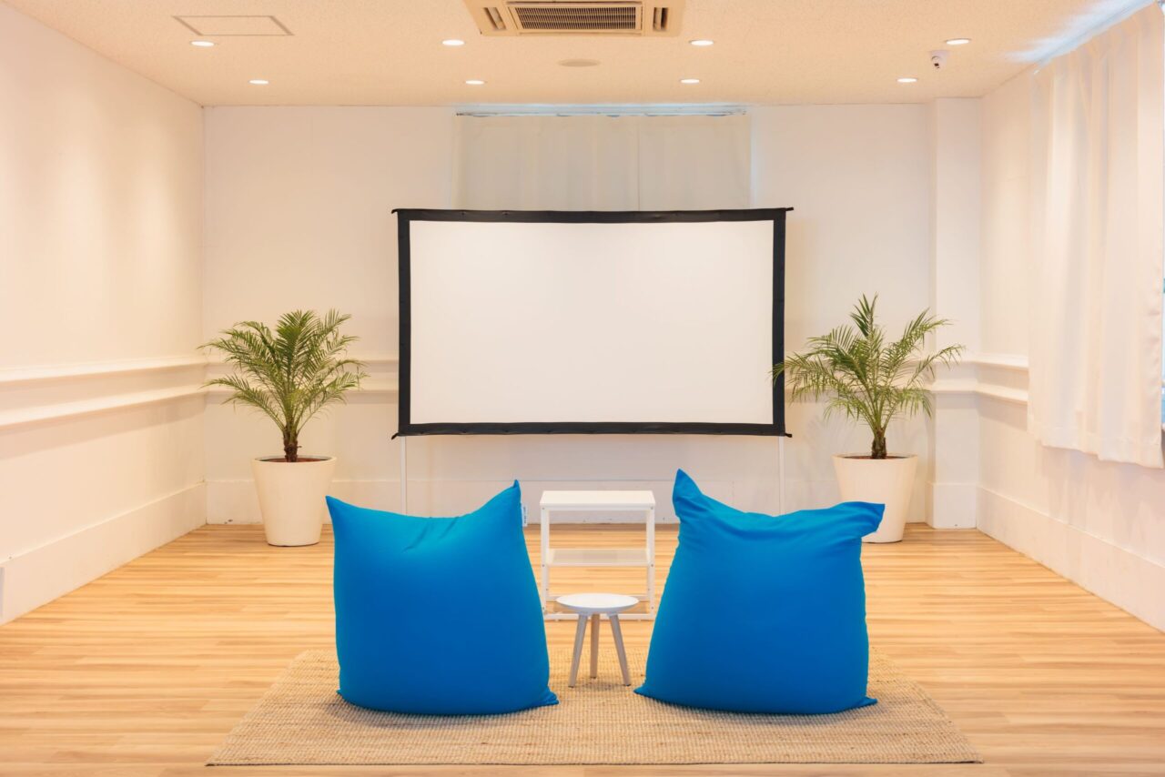 室内にはヒーリングミュージックが流れ、広々とした空間にソファや大きなマットスペース、ヨギボーなど設置されております。またビールやソフトドリンクの自動販売機も設置され、雨天時や隙間時間などのご利用に最適な空間となっています。