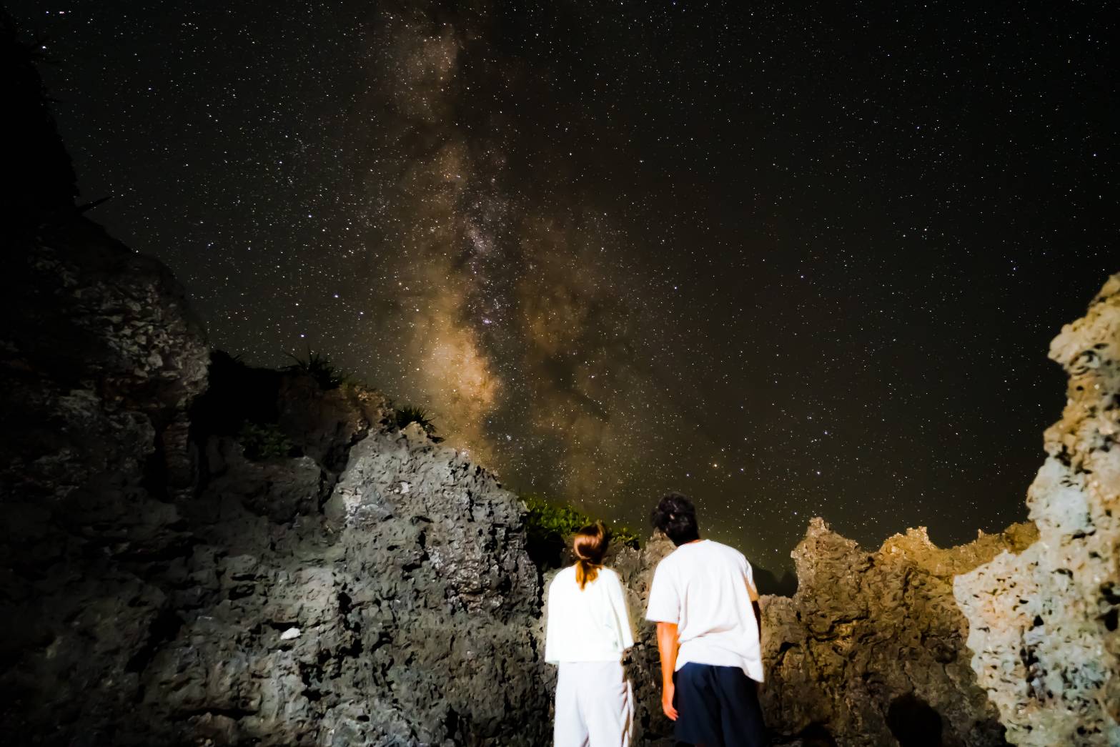 ③マリンスタッフ主催の宙旅&ナイトヒーリングに参加して、夜の海面で光りを放つ幻想的な夜光虫や夜空一面に輝く満天の星空を観察する。 与論島の澄んだ空気は星が降り注ぐかのように間近に感じます!