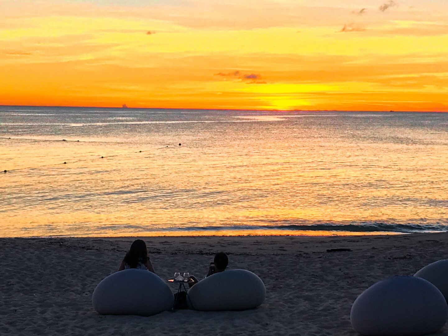①ホテルの目の前に広がるビーチで波音に耳を傾けながら、黄金に輝く夕日が水平線へゆっくりと沈んでいくのを静かに眺める。日が沈むにつれ空に広がり始める星の美しさには感動します。