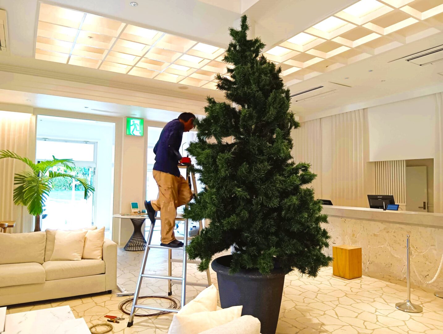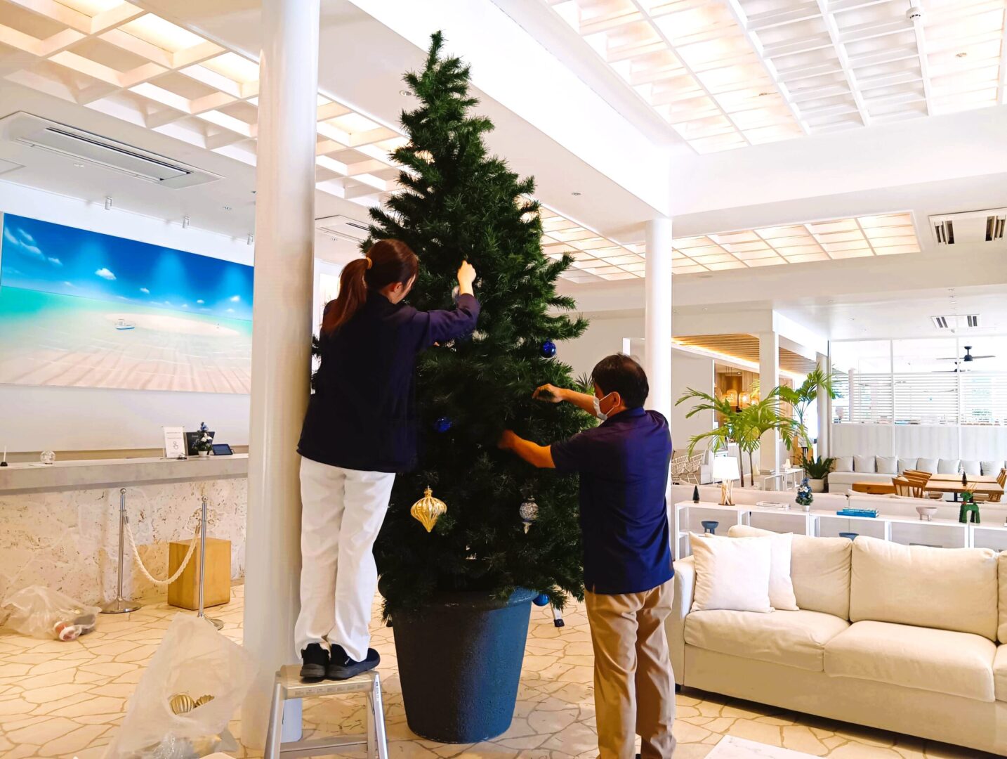 プリシアリゾートヨロンでも、与論を訪れた皆様にクリスマスムードを楽しんでいただくため、フロント棟に巨大なクリスマスツリーを飾りました。今年もランドスケープスタッフがツリーを組み立て、フロントスタッフがデコレーションをしてくれました。1日がかりの大変な作業でしたが、おかげで素敵なツリーが出来上がりました!