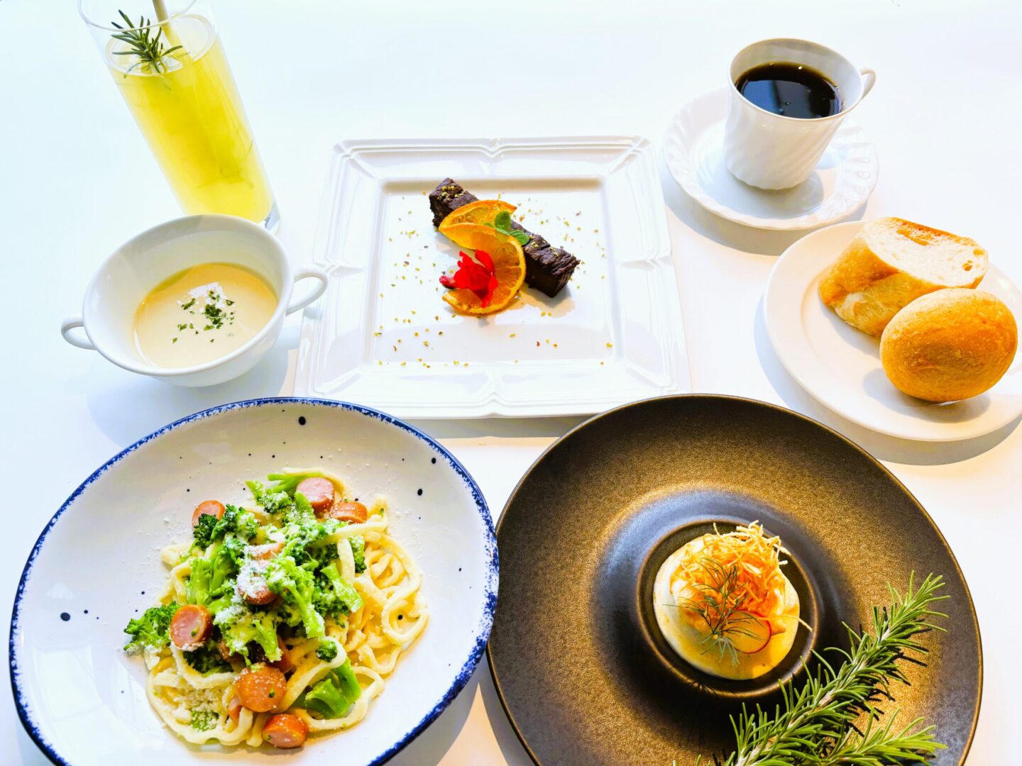 ①ソースがよく絡む自家製ロングパスタのキタッラ(イタリア中部アブルッツォ地方の郷土パスタ)に、沖縄豚の旨味を吸い込んだブロッコリーのソースとパルミジャーノチーズの芳醇なコク。素朴ながらも贅沢な味を楽しめます。