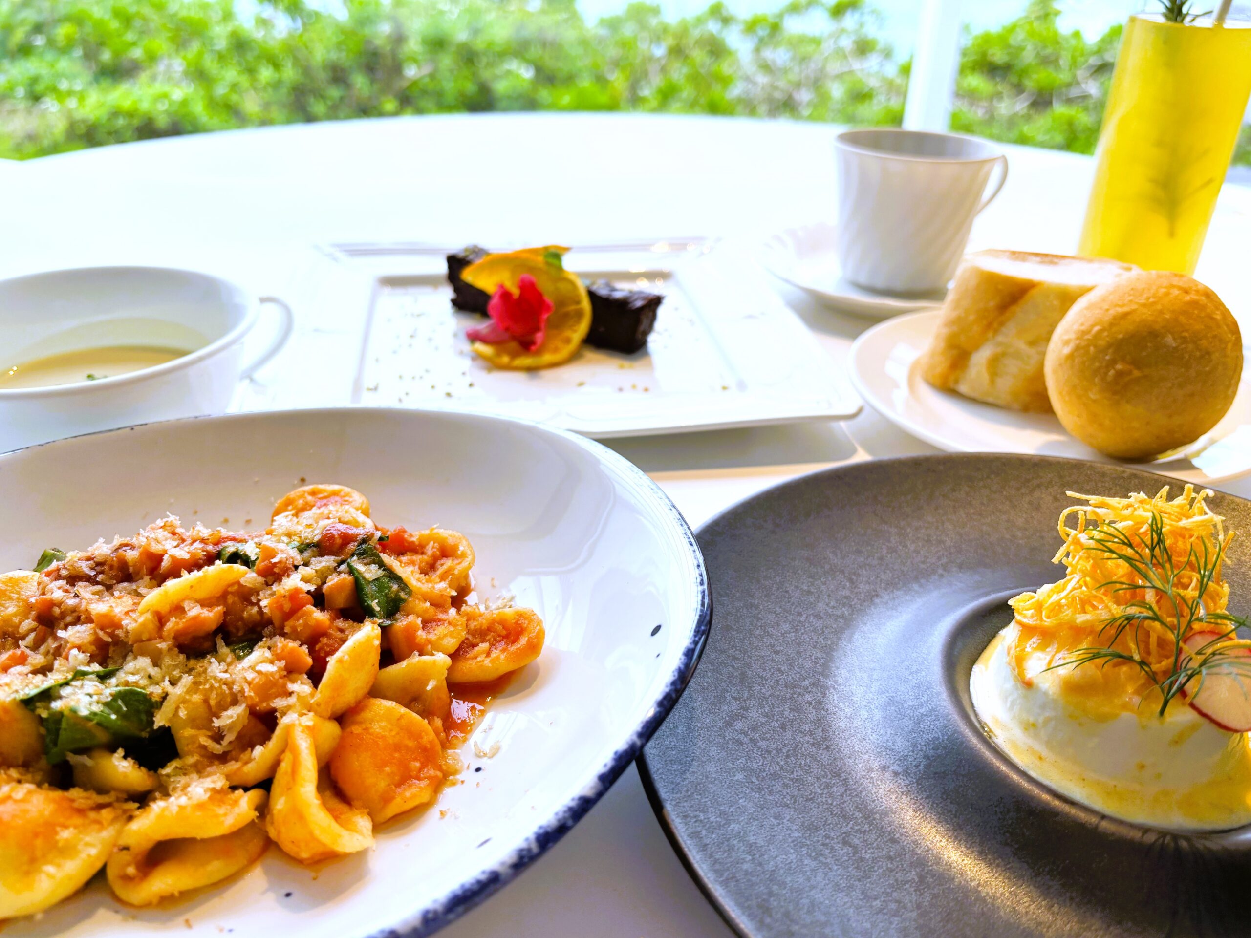 | *季節のお浸し *ミニ鮪漬け丼・ミニばらチラシ丼 *清し汁 アオサ 葱 *柚子の香るアロエゼリー | *ズワイガニとカリフラワーの塩パンナコッタ *本日のスープ *①自家製ロングパスタ キタッラ 沖縄豚ソーセージのブロッコリーソース パルミジャーノチーズ風味 ②自家製ショートパスタ オレキエッテ 蛸のラグーと島野菜のトマトソース *生チョコチーズのトルタ | *提供場所 地中海レストラン アネリア *提供期間 2月1日-2月28日 *提供時間 11:30-15:00(LO14:30) *料金 2,500円(税込) *予約 前日20時までの完全予約制 |