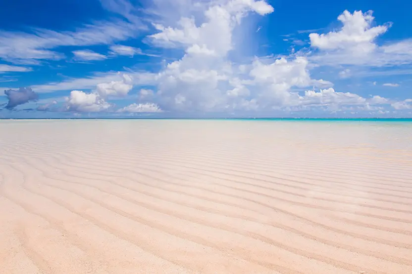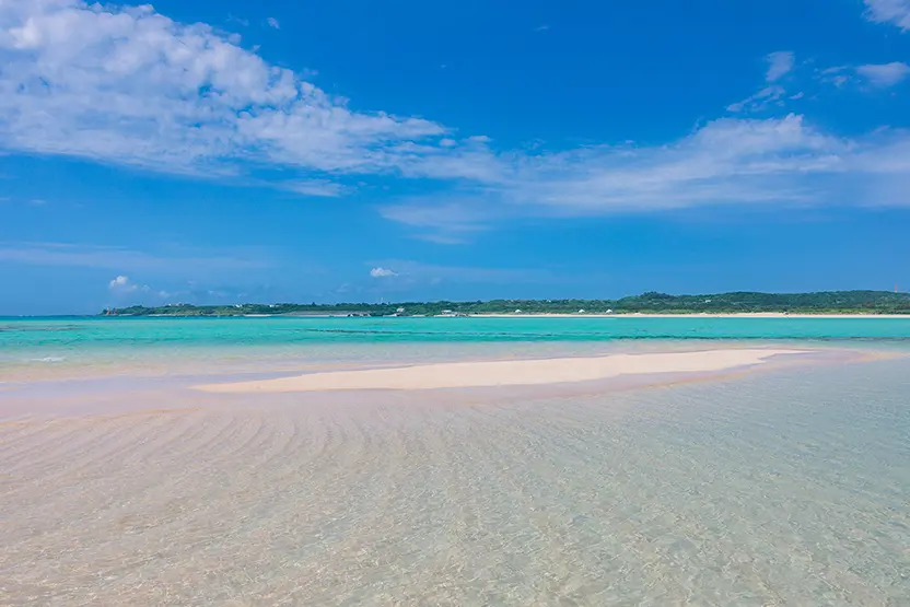 例年、春から秋にかけて中潮から大潮の干潮時だけに姿を現す真っ白な砂浜です。 海面は太陽の光をうけてキラキラと輝き、白い砂浜とエメラルドグリーンの海の色はまさに地球の楽園。与論島だけでしか見られない絶景です。百合ヶ浜の白い砂浜には星の砂があり、「年齢の数だけ星の砂を拾うと幸せになれる」という言い伝えもあります。